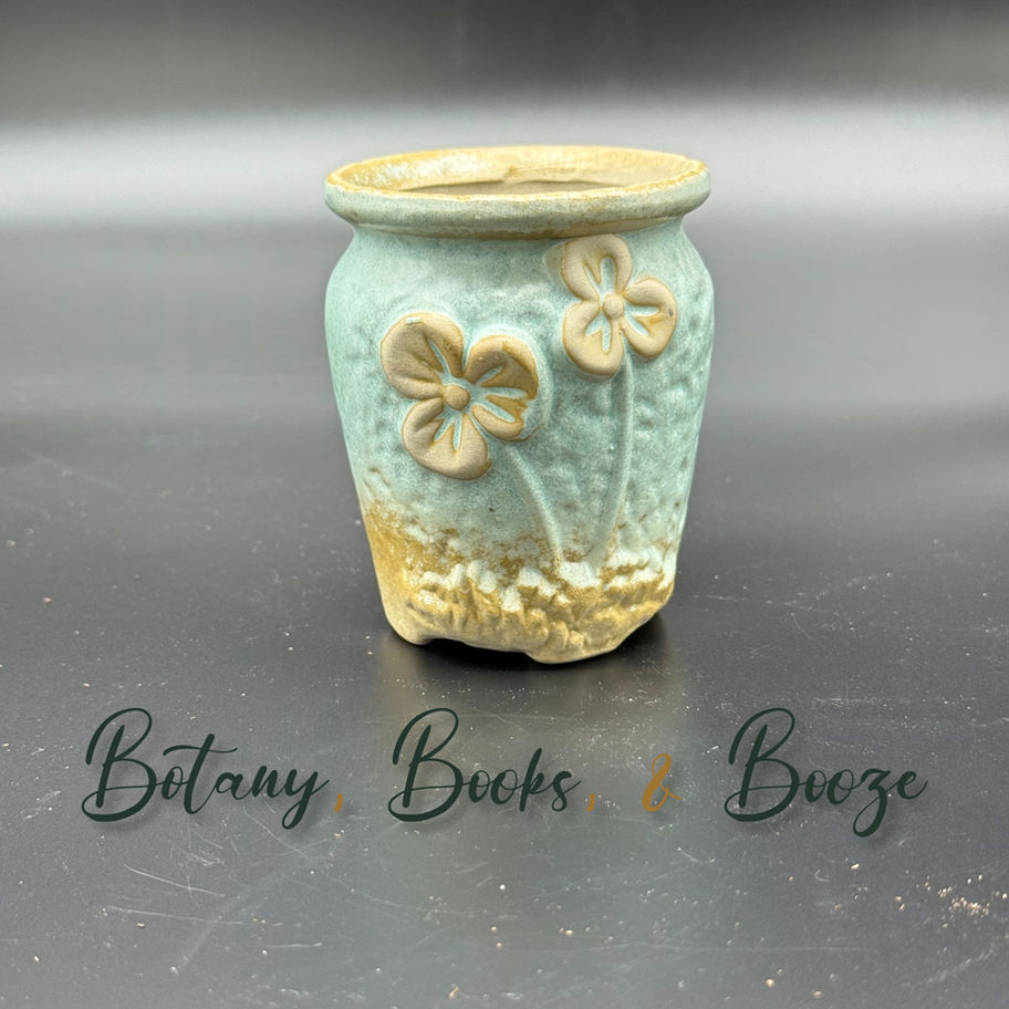 Blue small pot, grey with 2 flowers. 3.5" tall, 2.5" wide with drain hole