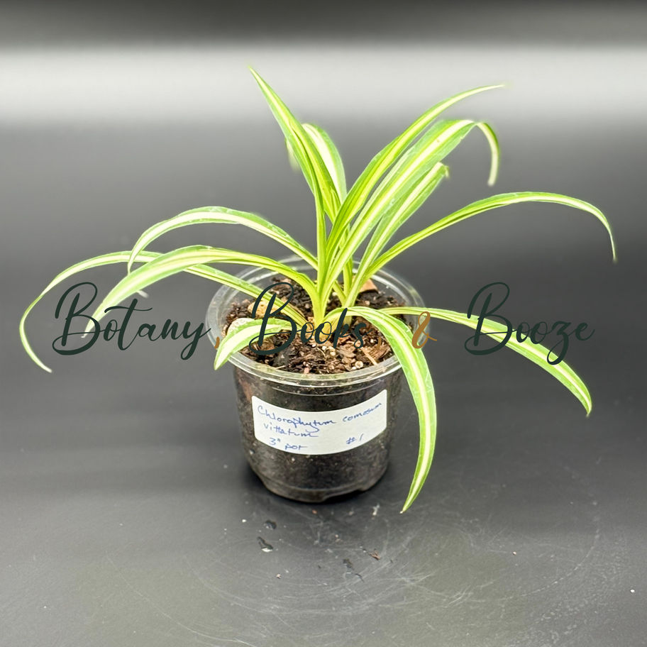Classic green and white striped arching leaves. Easy-care, produces baby plantlets. Growth Habit: Clumping with arching leaves. Light: Low to bright indirect light. Soil: Well-draining potting mix. Water: Moderately moist; tolerates some dryness. Fertilizer: Balanced fertilizer monthly during growing season. Temperature: 60-75°F; adaptable. Toxicity: NON-TOXIC; safe for pets!. Mature Size: 12-24" tall with arching leaves. Flowering: Small white flowers; produces baby plantlets.