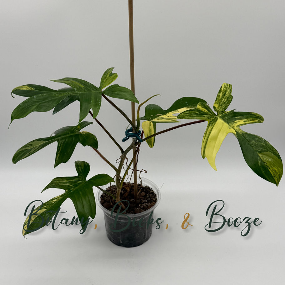 Stunning hybrid philodendron with dramatic variegated lobed leaves featuring creamy white, yellow, and bright green marbling on each uniquely patterned leaf. The leaves are elongated and heart-shaped with deeply serrated edges and distinctive lobes at the base, reaching 6-12 inches at maturity (up to 18" when climbing with support).