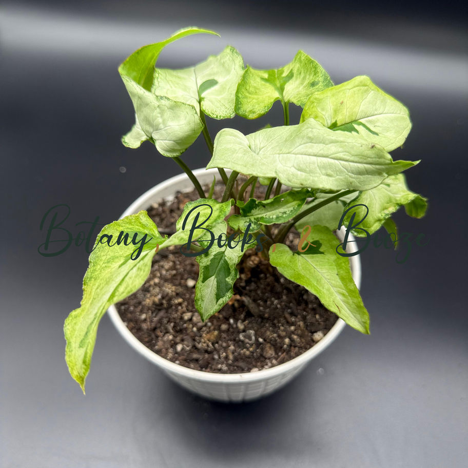 Cream, pink, and green variegation. Highly variegated rare cultivar. Growth Habit: Climbing/trailing vine. Light: Bright indirect light. Soil: Well-draining mix with perlite. Water: Moderately moist; allow top inch to dry. Fertilizer: Balanced fertilizer monthly spring-summer. Temperature: 60-80°F; adaptable. Toxicity: TOXIC to pets/humans. Calcium oxalate. Mature Size: Vining/climbing; 3-6 feet. Flowering: Rare indoors.