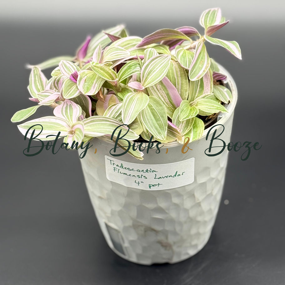 Purple and green striped trailing leaves. Fast-growing and colorful for hanging baskets. Growth Habit: Trailing vine. Light: Bright indirect light for best color. Soil: Well-draining potting mix. Water: Keep moderately moist. Fertilizer: Balanced fertilizer monthly spring-summer. Temperature: 60-80°F; tolerant. Toxicity: MILDLY TOXIC to pets. Can cause skin irritation. Mature Size: Trailing; 6-12" tall, spreads widely. Flowering: Small purple, pink, or white flowers.